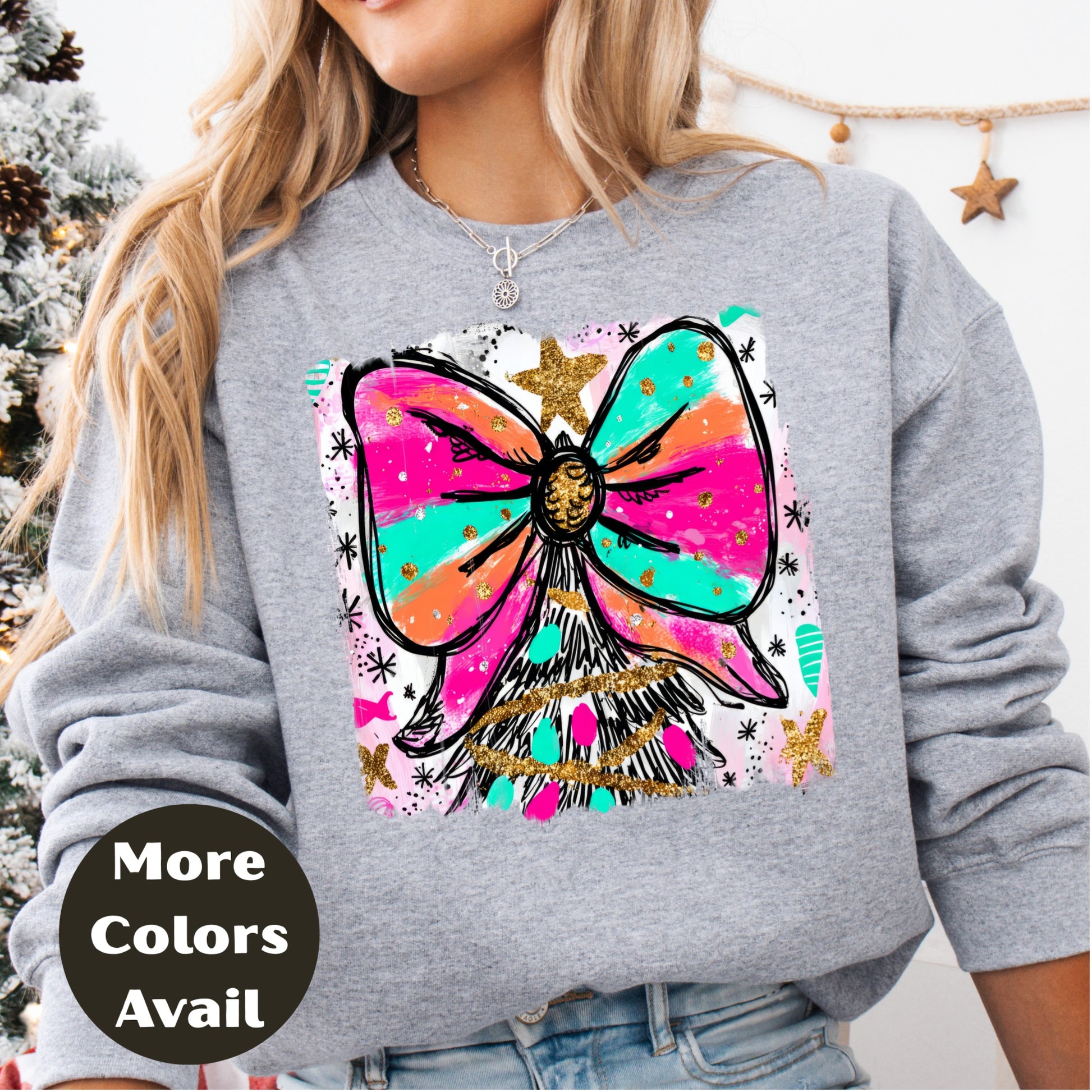 Bright Bow Christmas Tree Shirt or Sweatshirt – Colorful Neon Holiday Top S-4XL Plus Size – Festive Christmas Tee