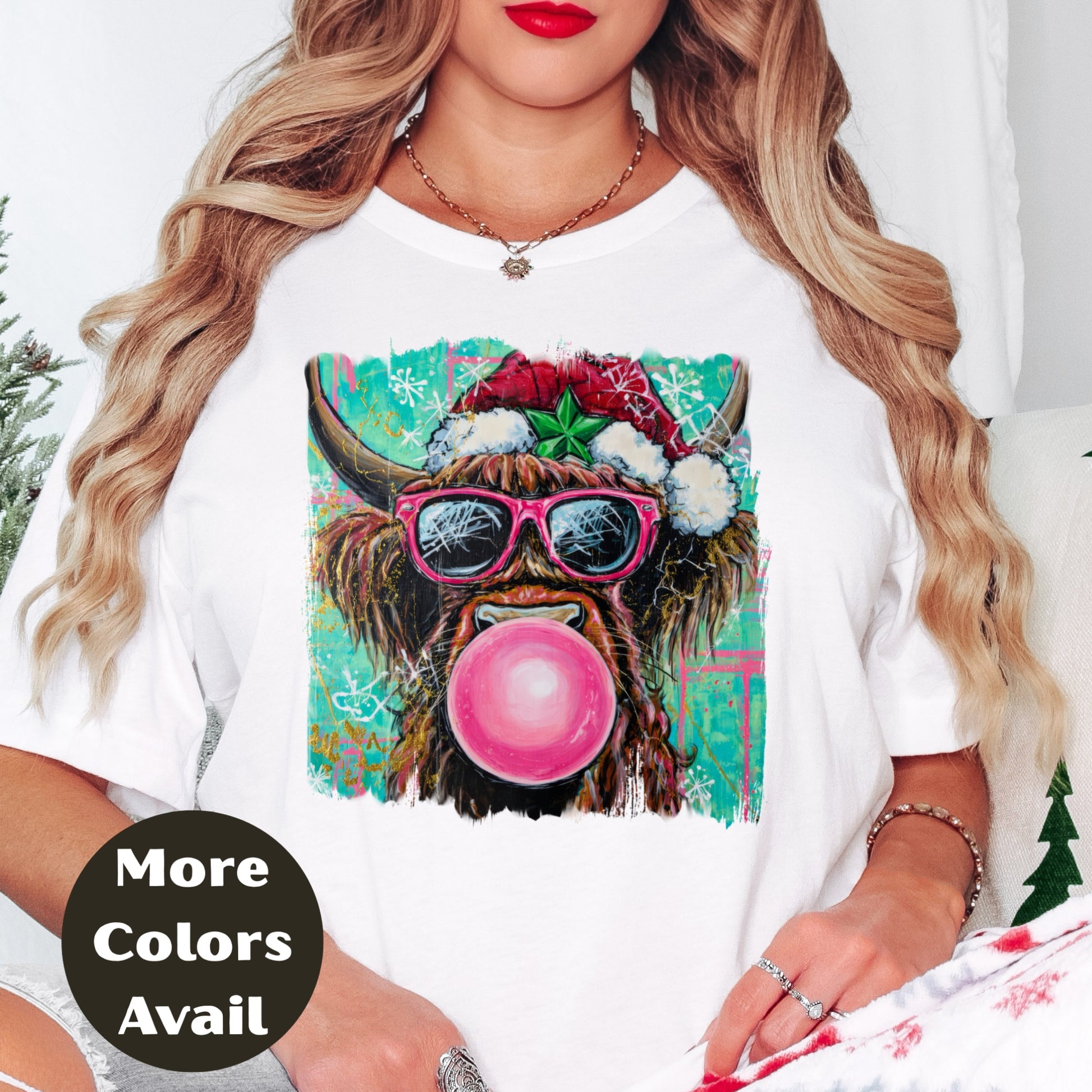 Add some quirky holiday fun to your wardrobe with this Bubblegum Highland Cow Christmas Shirt or Sweatshirt! Featuring a festive Highland cow in pink sunglasses, a Santa hat, and blowing a giant bubblegum bubble, this design is a must-have for cow lovers, country girls, and anyone who loves unique Christmas style.