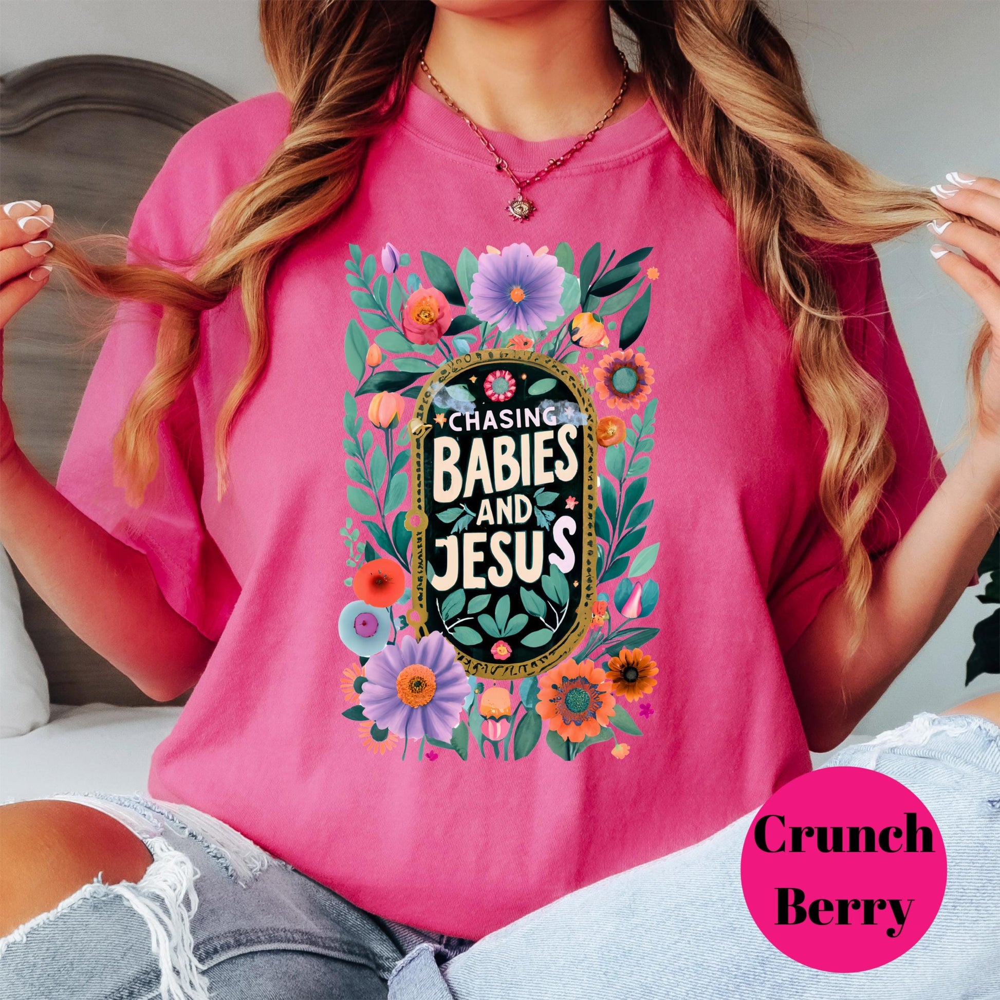 Chasing Babies and Jesus Shirt, Comfort Colors® Floral Christian Mom Tee, Faith and Motherhood Shirt, Pastel Jesus Lover T-Shirt