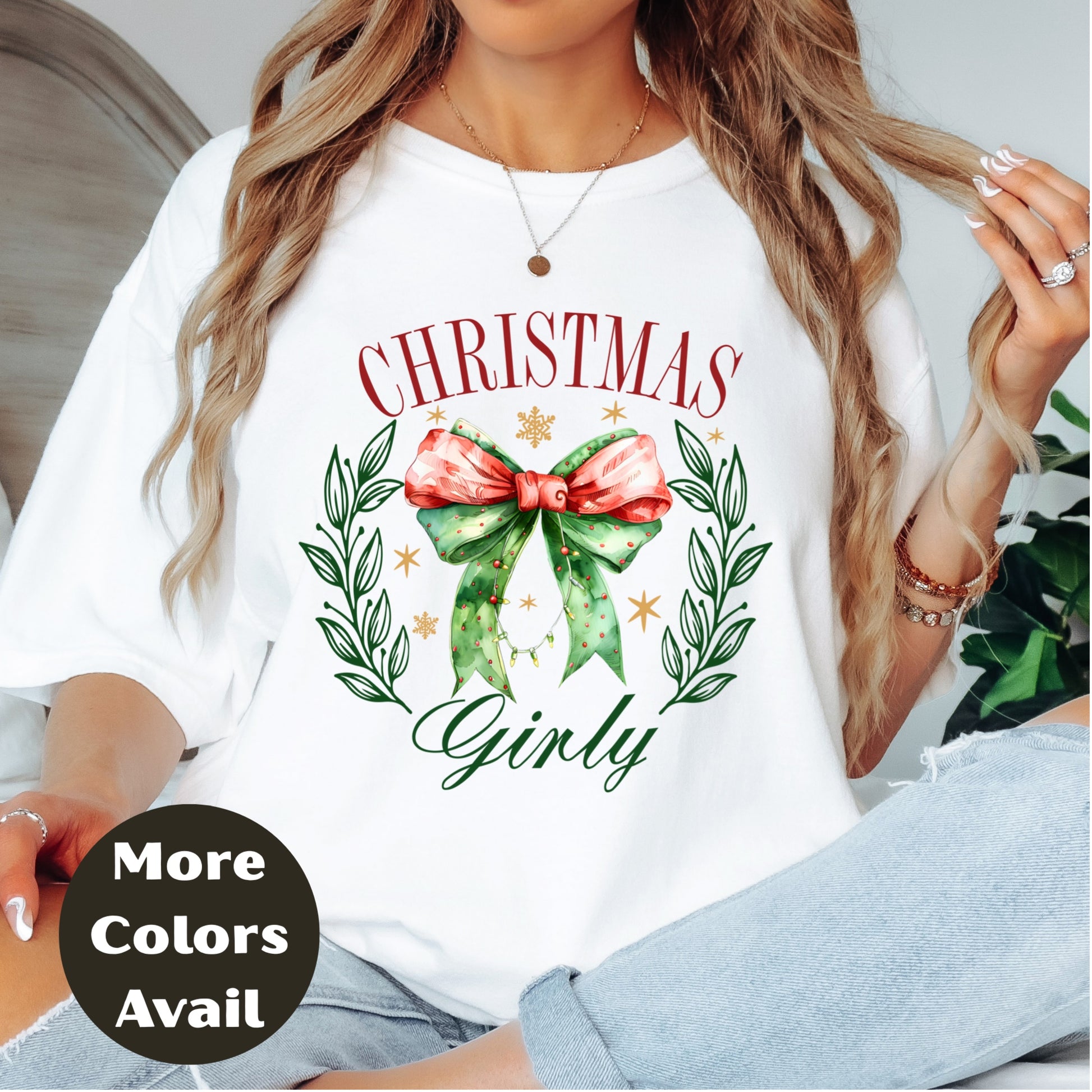 Christmas Girly Shirt or Sweatshirt – Festive Bow & Wreath Holiday Top – Cute Winter Shirt – Small-4XL and Plus Size – Multiple Colors