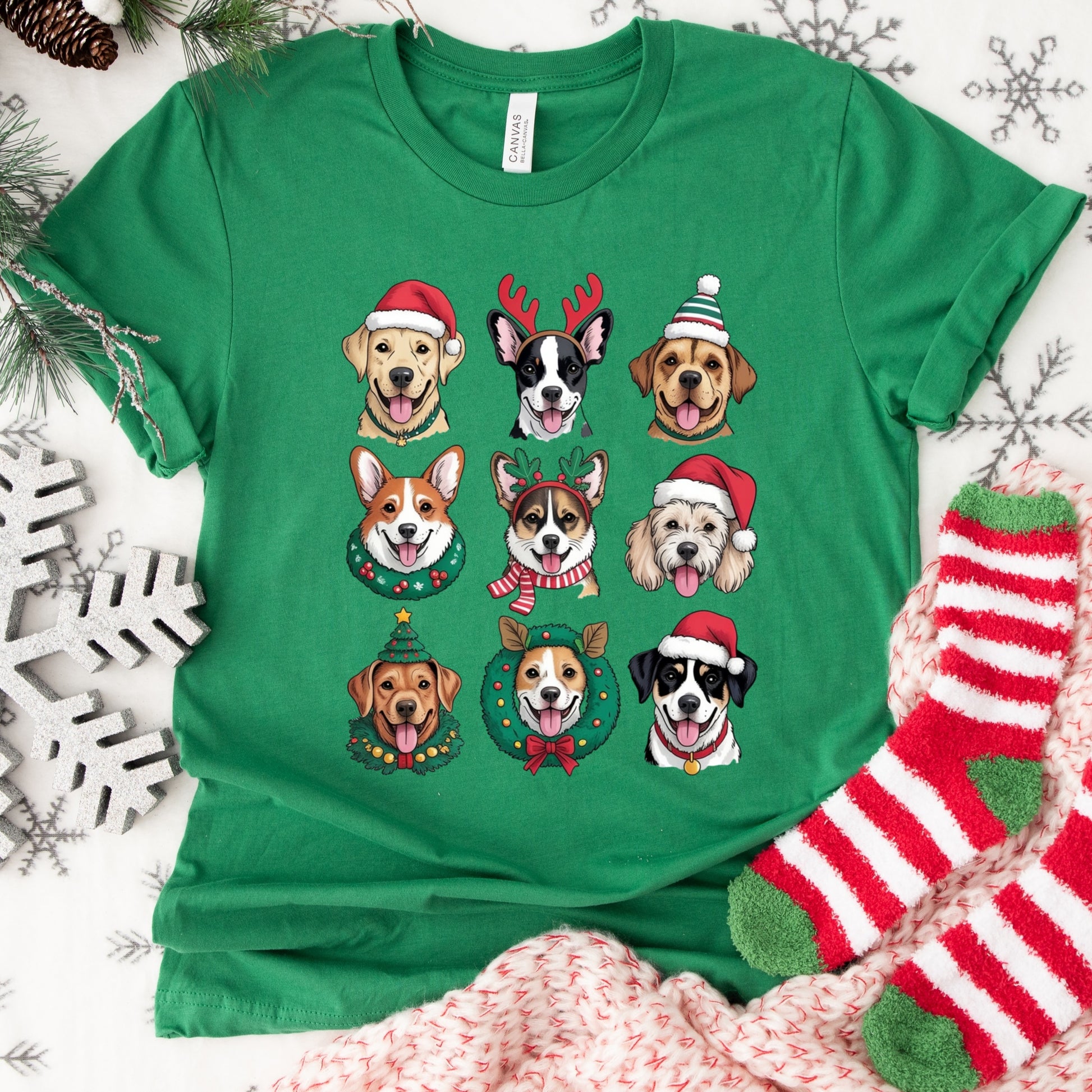 Celebrate Christmas with this adorable Holiday Dogs shirt! Featuring nine festive pups in Santa hats and wreaths — perfect for dog lovers and holiday fun.