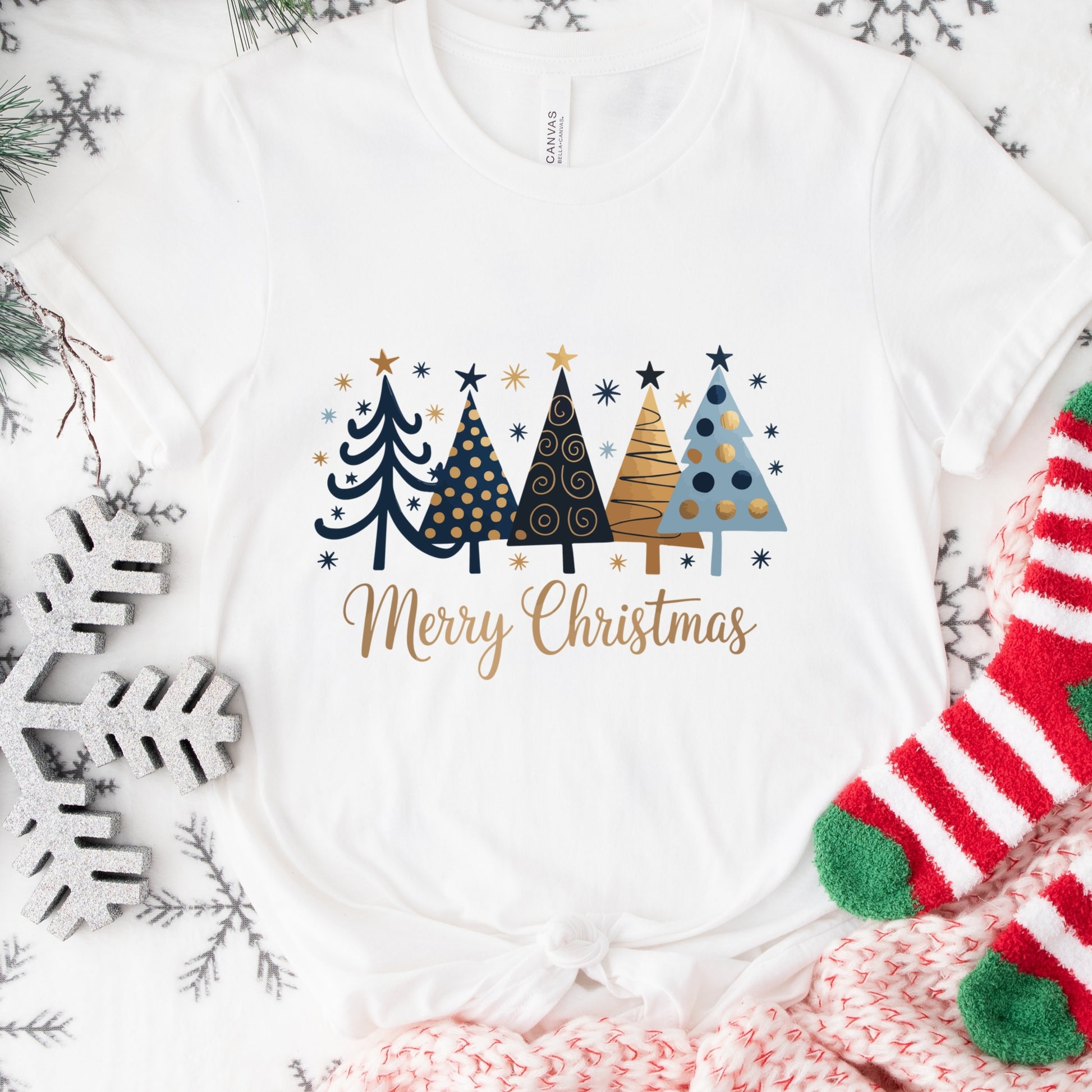 This minimalist yet festive Christmas shirt showcases a row of blue, gold, and black patterned trees with elegant “Merry Christmas” lettering. Perfect for those who prefer sophisticated seasonal style without the sparkle overload.