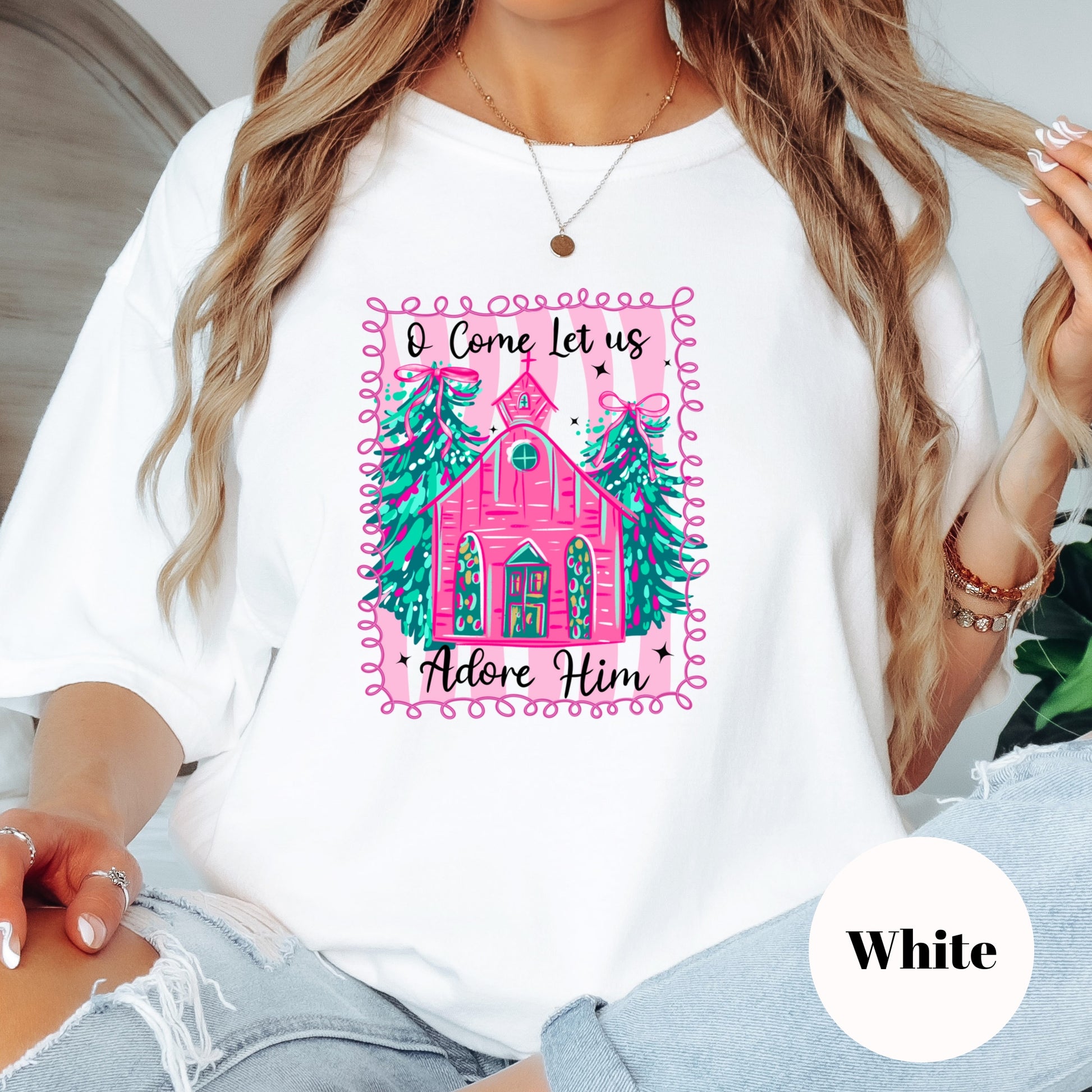 Christmas Shirt: O Come Let Us Adore Him – Pink Church Christian Tee or Sweatshirt