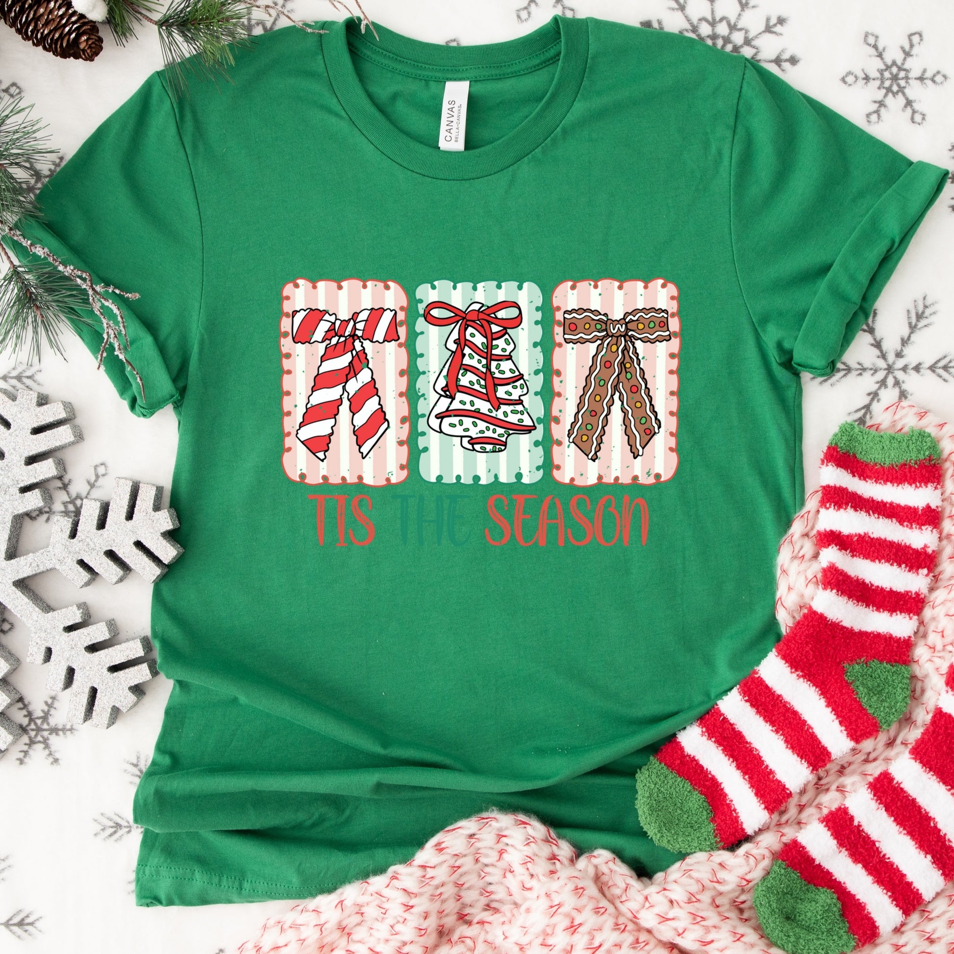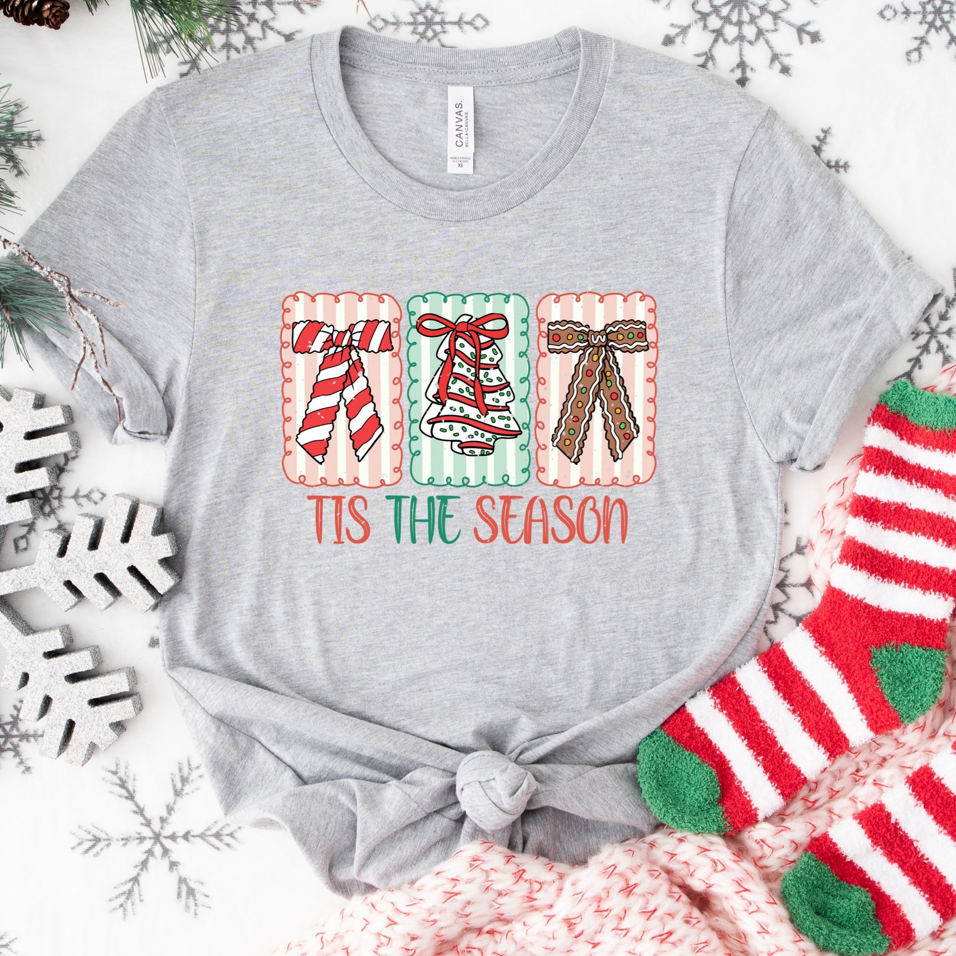 ’Tis the Season for festive style! This adorable Christmas shirt features candy cane, tree, and gingerbread bows — perfect for holiday parties and cozy days.
