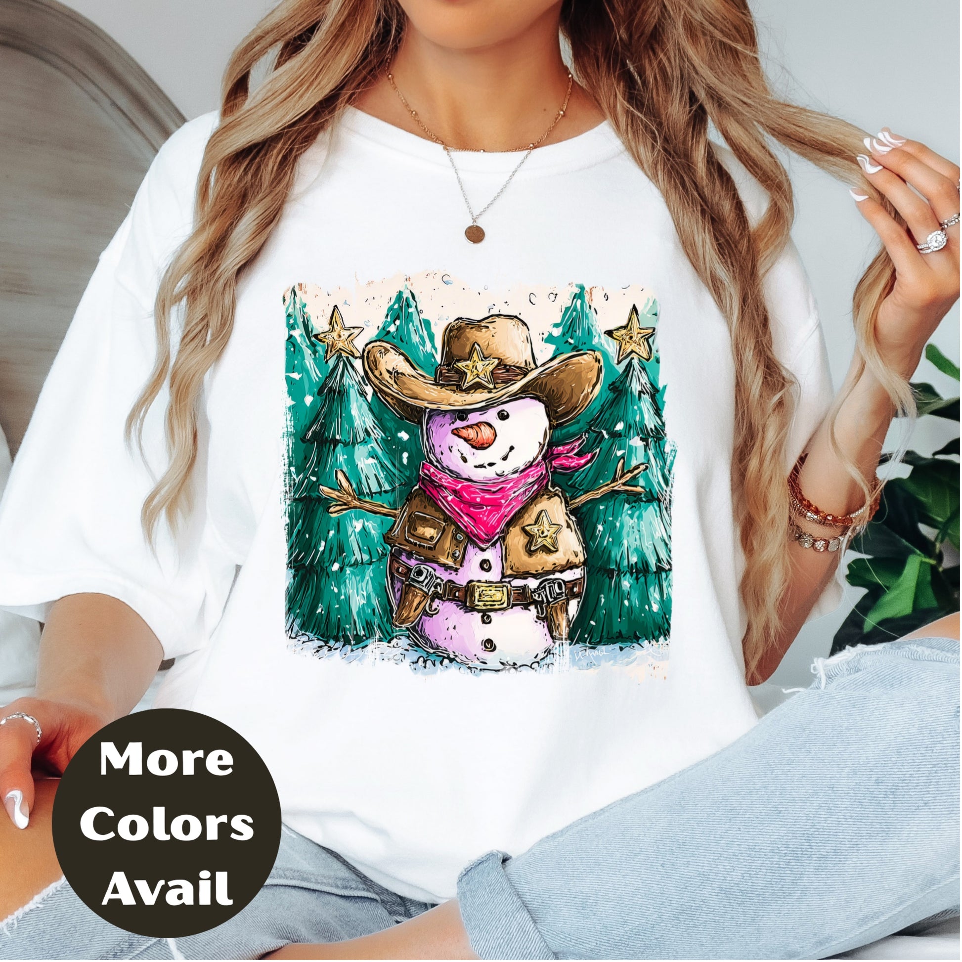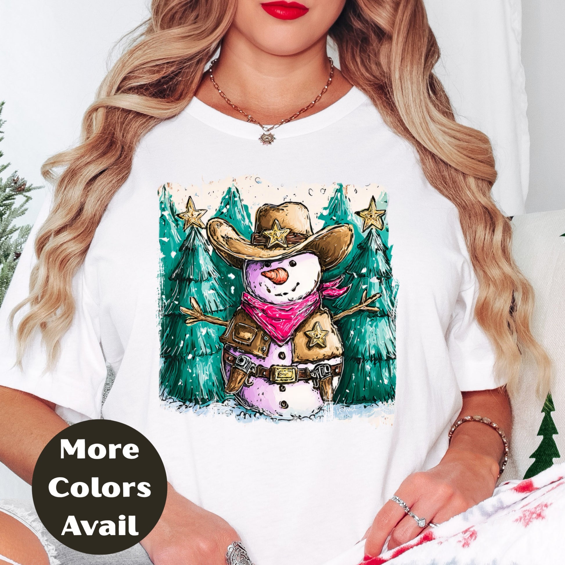 Cowboy Snowman Christmas Shirt – Hand drawn western holiday tee S-4XL. Features a cute snowman in a cowboy hat. Sizes S-4XL, multiple color options.