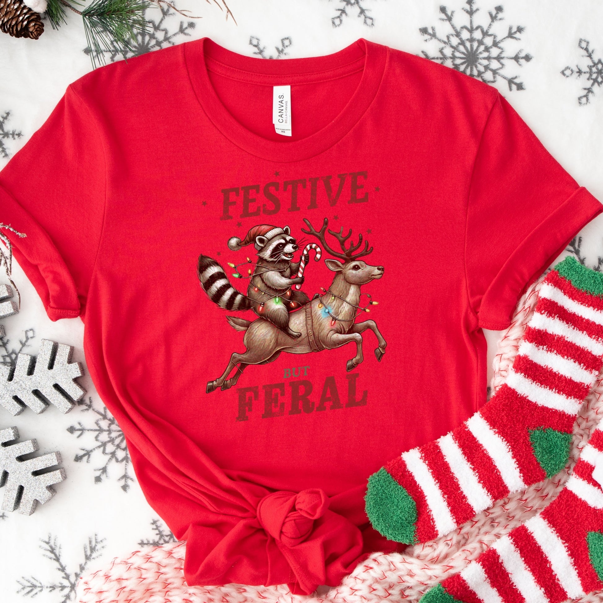 Stay wild this holiday with the Festive But Feral Shirt or Sweatshirt! Funny raccoon Christmas top, multiple colors, sizes S-4XL, plus size available.