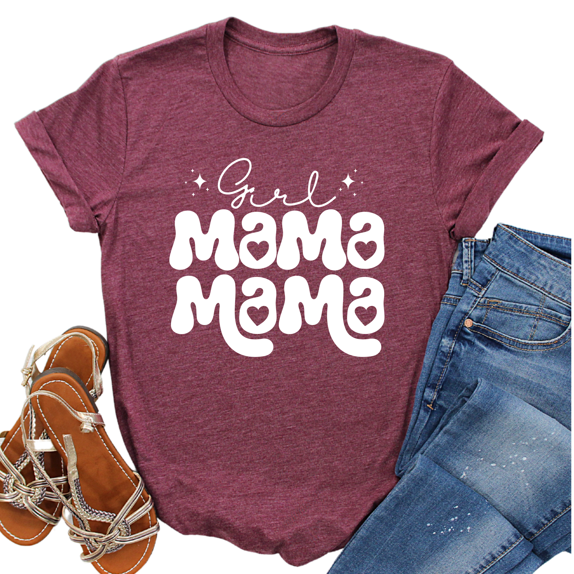 Celebrate being a girl mom with this retro "Girl Mama" T-shirt featuring a playful design and heart accents.