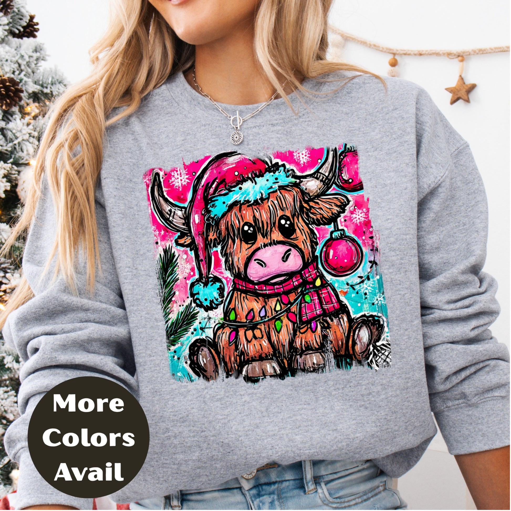 Spread country Christmas cheer with this adorable Highland Cow Christmas Shirt or Sweatshirt! Featuring a hand-drawn highland cow in a Santa hat, surrounded by ornaments and twinkling holiday lights, this tee or sweatshirt is the perfect blend of rustic charm and festive fun. Available in sizes S-4XL and a variety of colors for the ultimate cozy holiday style.