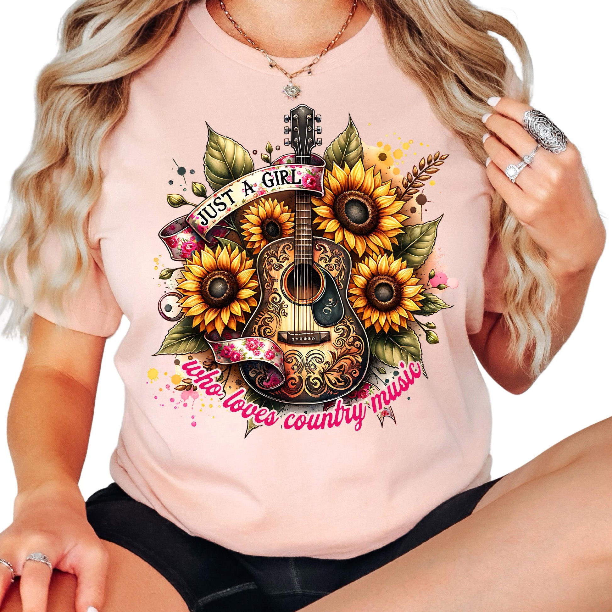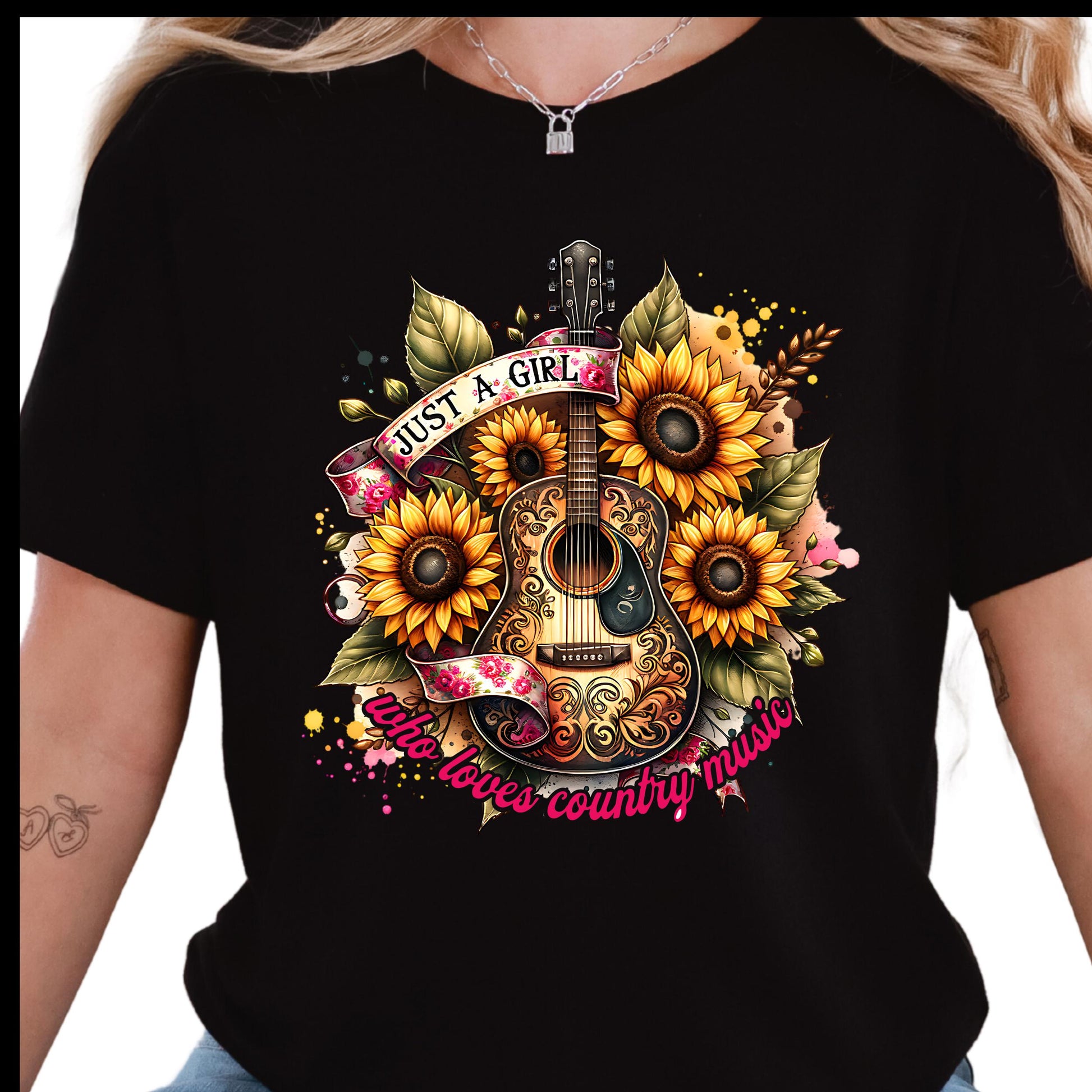 Beautiful country music design: Features a guitar, vibrant sunflowers, and the phrase "Just a Girl Who Loves Country Music" for a bold statement.