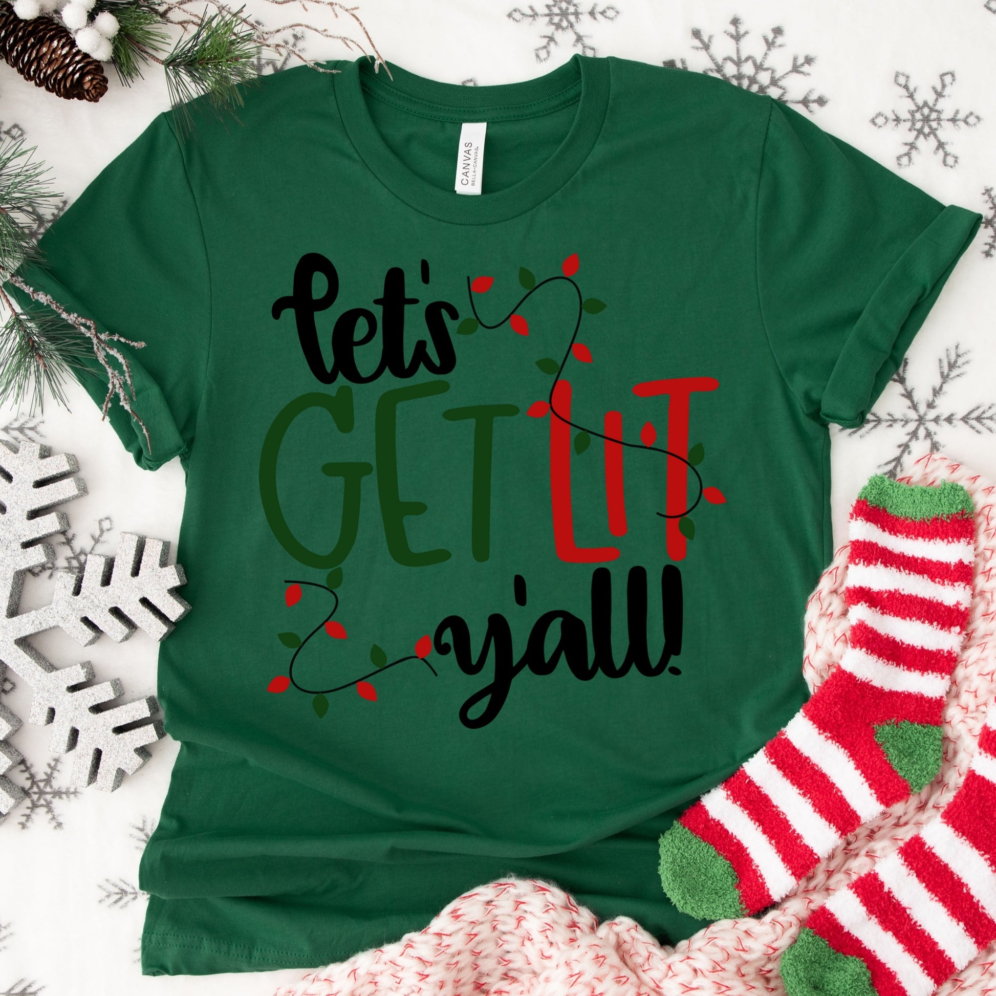 Let’s Get Lit Y’all Shirt or Sweatshirt – Funny Christmas Lights Top – S-4XL Plus Size – Multiple Colors