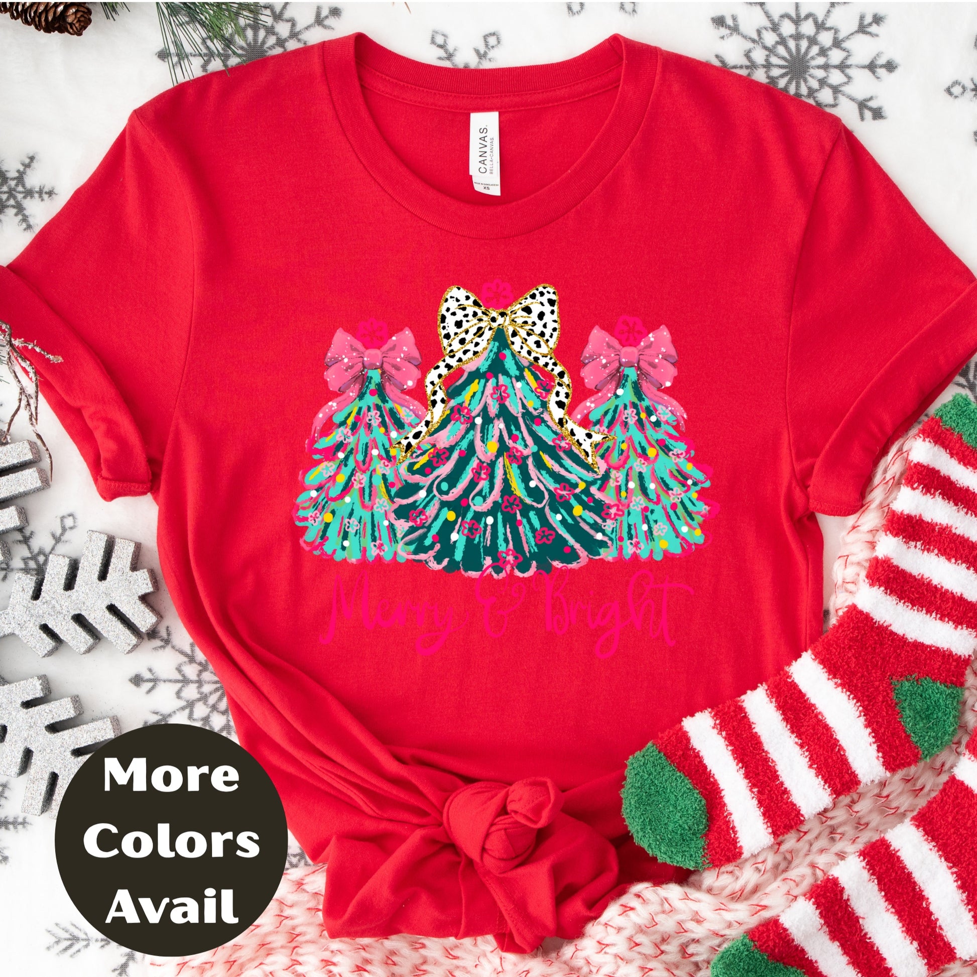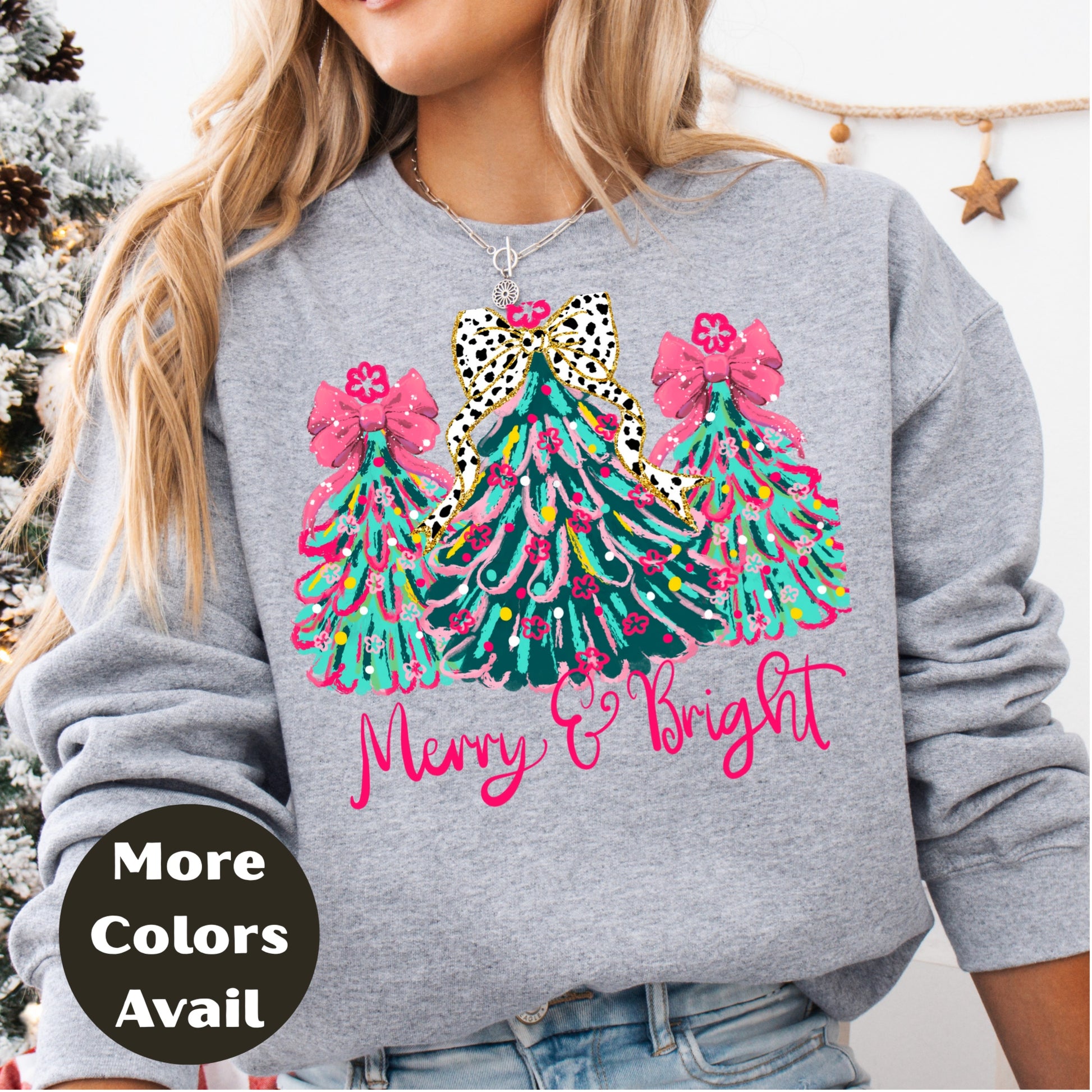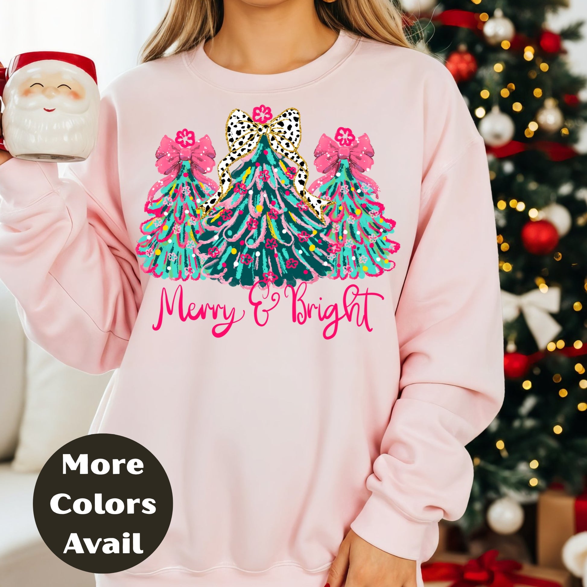 Merry & Bright Christmas Shirt or Sweatshirt – Pink Bow Christmas Trees Tee – Festive Holiday Top – S-4XL Plus Size – Multiple Colors