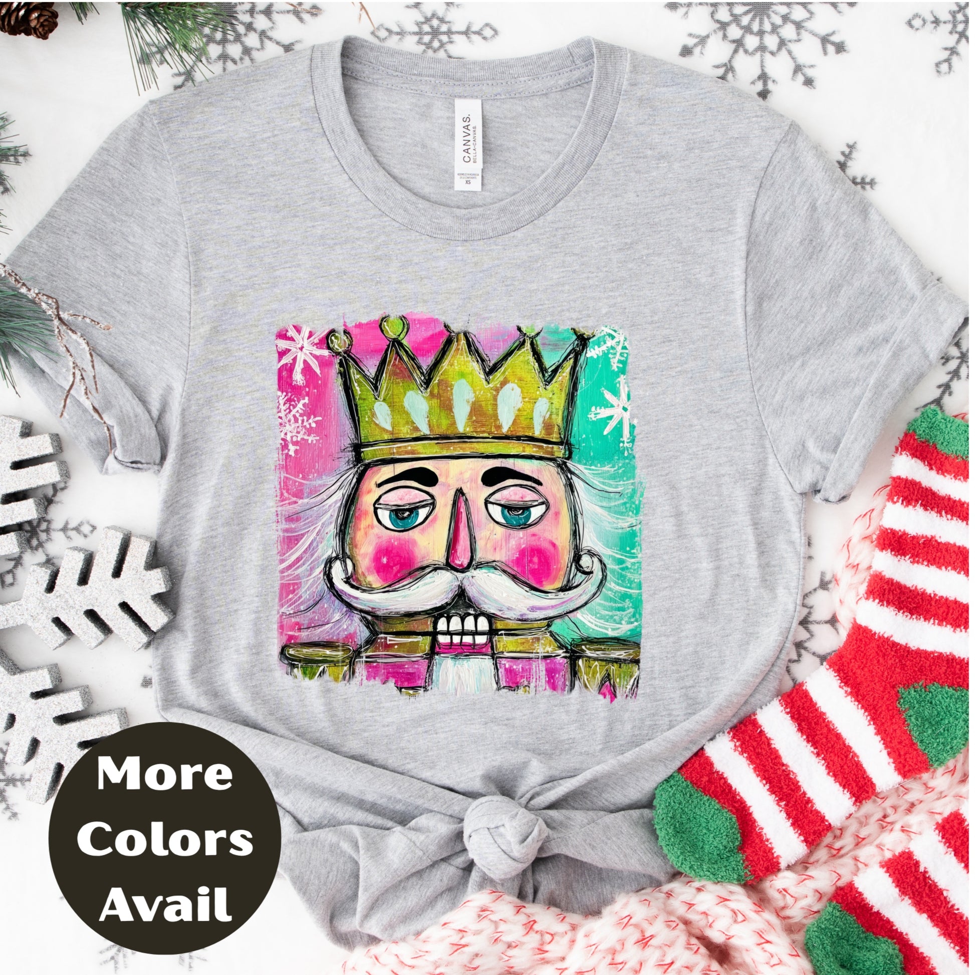 Bring a bold pop of color to your holiday wardrobe with this Nutcracker King shirt or sweatshirt! Featuring a vibrant, hand-drawn nutcracker design in pink, teal, and gold tones, this festive top is perfect for Christmas parties, cozy family photos, or just spreading a little cheer. Each shirt or sweatshirt is available in a full range of unisex adult sizes S-4XL (plus size friendly) and several color options, making it easy to find your perfect fit and style.